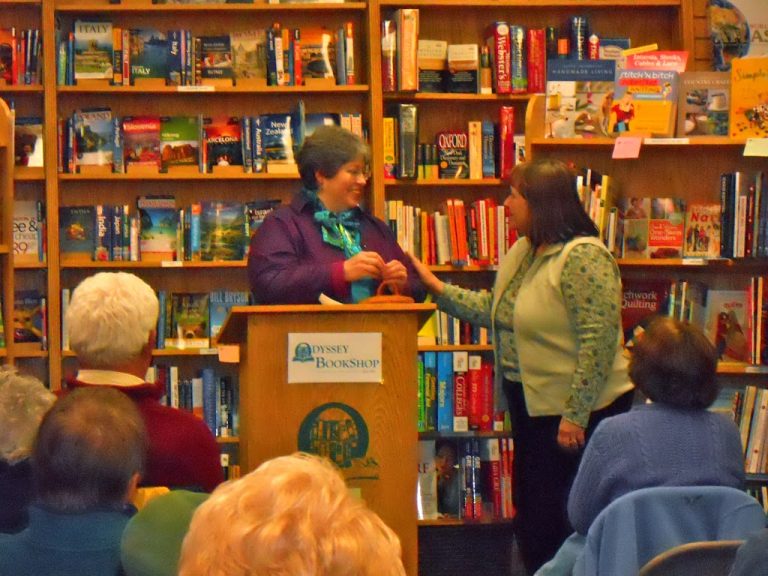 Last night I spoke at Odyssey Books in South Hadley, where I met Peggy, who has been following my blog for a while now. I love comments from “the regulars” on my blog, because I feel I get to know you. Last night was the icing on the cake for me, when I met Lynn for real, not just virtually. She was in this area visiting, so she made it to my appearance. She pulled the name for the winner of the Little Village Giveaway.