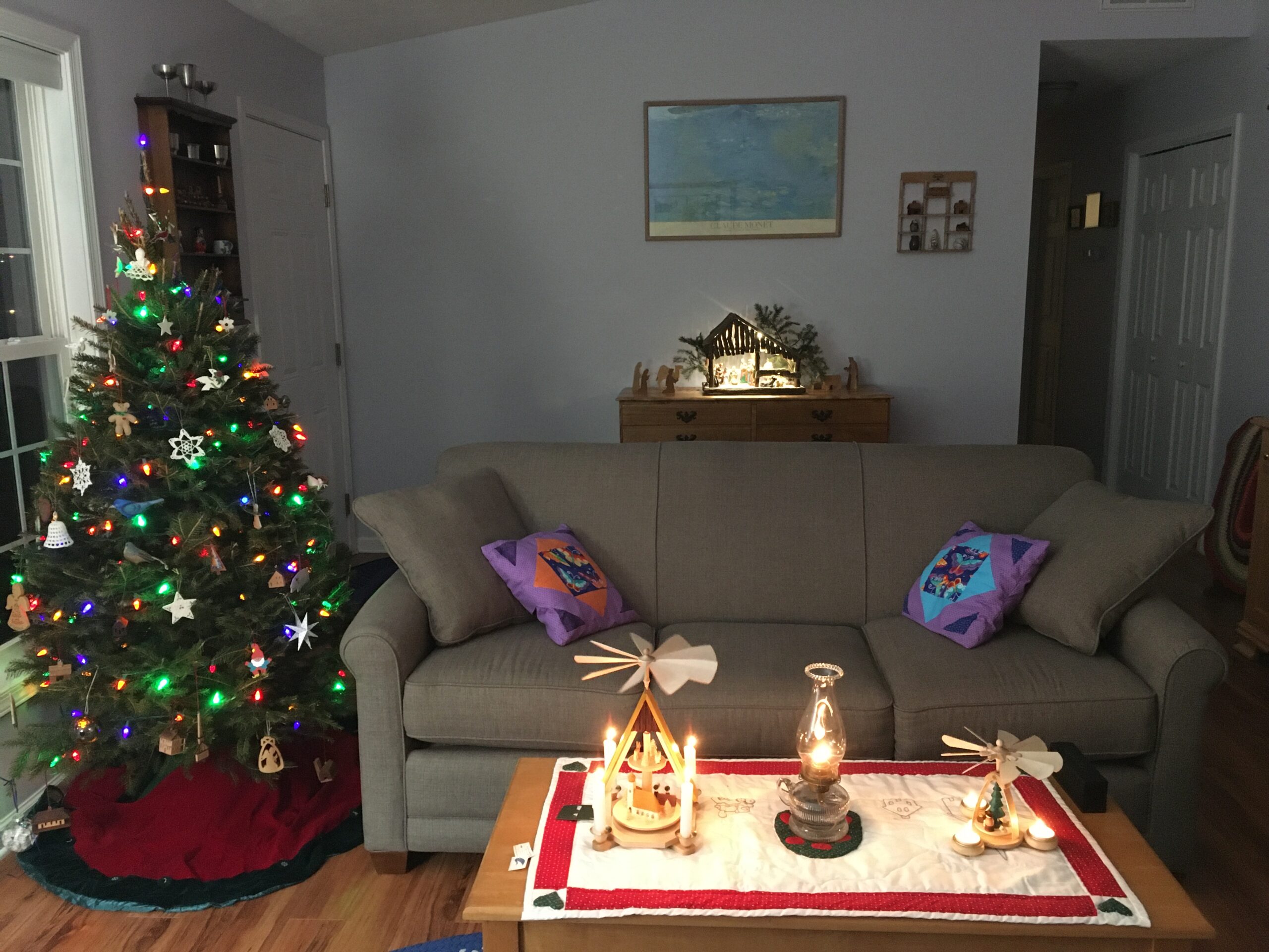 David and I discussed the possibility of not getting a Christmas tree this year. It was tempting to forego the ritual of going on the hunt for just the right tree for our living room. But then David said, “We should probably get one to make up for all the years you couldn’t have one.” So we drove to Singers Glen and found a smaller than our usual tree, but it still looks nice all decorated. Some of our ornaments date back to our first Christmas together, and others remind us of the times when our sons were little and they would help hang ornaments. Then there are those from their school years when they made ornaments from walnuts, paper, or wood. We still find a place on our tree each year for these ornaments infused with memories of Christmases past.