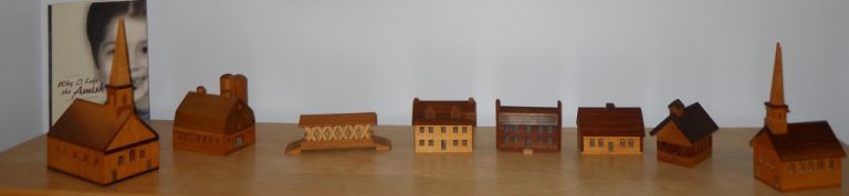 From left to right: Large church, barn, covered bridge, colonial house, town house, cape, schoolhouse, and small church