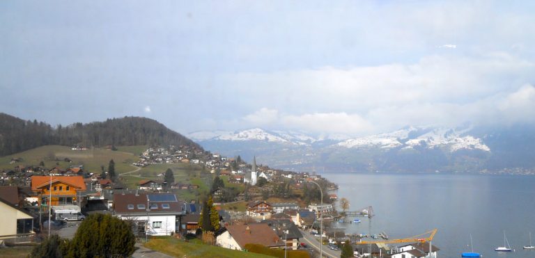 Once the train had climbed high above the valleys below, it began descending. The sound of the brakes were louder than the revving of the engines during the climb. I was glad those brakes were working — I would not have wanted to be on a runaway train in that mountain pass! After leaving the village of Brienz, we began following the shores of Brienzersee, with snow-covered mountains in the background. The photos do not do the beauty of this region justice.