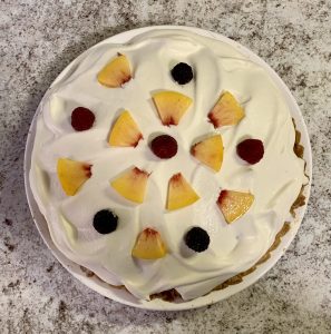 We have been frequenting the numerous fresh fruit and veggie stands run by Amish and Mennonite families in this area. It is divine to have such fresh and juicy peaches in season to eat plain and to make pies with. David and I took a pie to the young family whose two young sons we’ve adopted as our grandchildren. We now have nicknames for them. Our favorite five-year-old is Boy Chap, and his younger brother is Little Man. Once when we took a pie to their house, Boy Chap ate two bites of pie, and then he put his fork down, came around the table, and thanked me for making the pie and told me how much he loves it. Of course I needed to make another pie after that, especially while the peaches are still so yummy. Here is a photo of the pie made of peaches, red raspberries and black raspberries that we took over to their house.