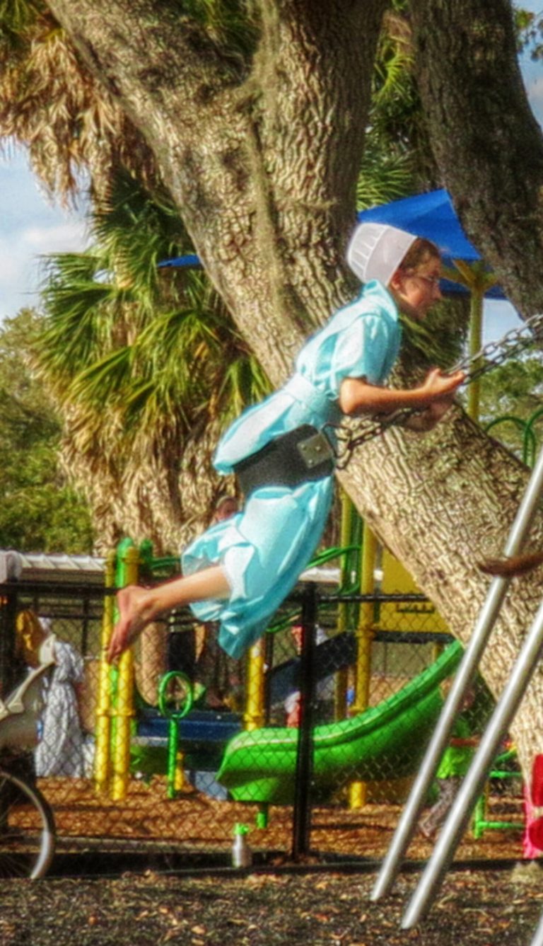 Lizzie would soon declare it was her turn. I could only push her a little bit. She was bigger and stronger, so once she got started, she could get the swing going high by pumping her legs.